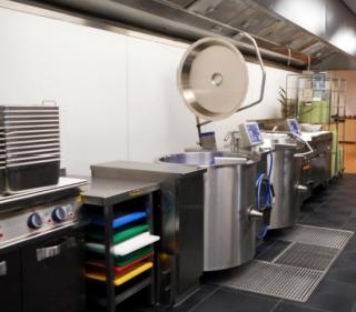 In augustus dit jaar werd ook de keuken onder handen genomen. De keuken werd groter en er kwamen twee gloednieuwe braadpannen. “Alle andere toestellen werden gewoon op een nieuwe plaats gezet, want toestellen zoals de ovens en dergelijke hadden we over de jaren heen al vernieuwd. Eigenlijk is vooral de inrichting dus veranderd. We probeerden ook hier een grote, open werkruimte te creëren. Het werkgemak van ons personeel is er door deze grotere keuken zeker op vooruitgegaan", vertelt Carlo. De keuken is nu zo opgedeeld dat de werknemers in één lijn naar de buffetten toe kunnen werken. Een opdeling van warme en koude keuken was niet nodig, want alle koude gerechten worden gemaakt in de productiekeuken, iets verderop in de campus. Ook bij deze werken, die een maand duurden, bleef de cafetaria open, maar met een verminderd aanbod. De keuken werd opnieuw met stofschermen afgespannen.